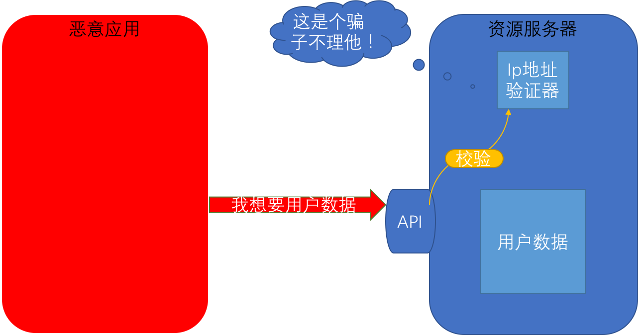 所以我们就需要对第三方的应用进行校验,比如最原始的方法是使用IP地址,如果是不认识的IP地址就不给他资源。