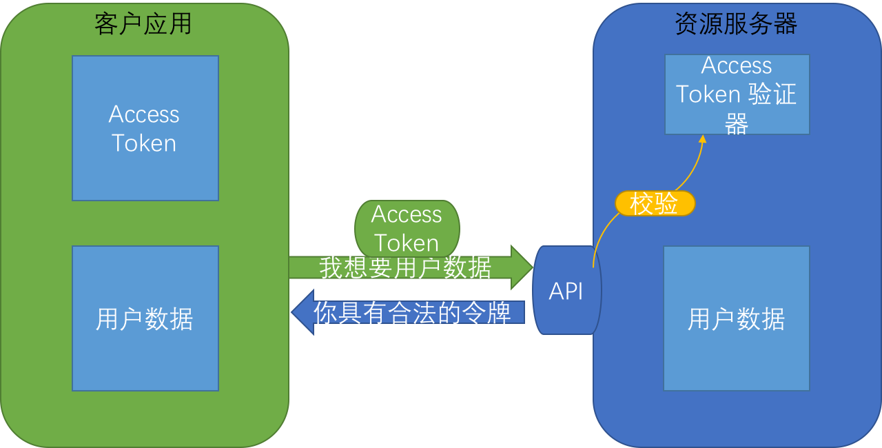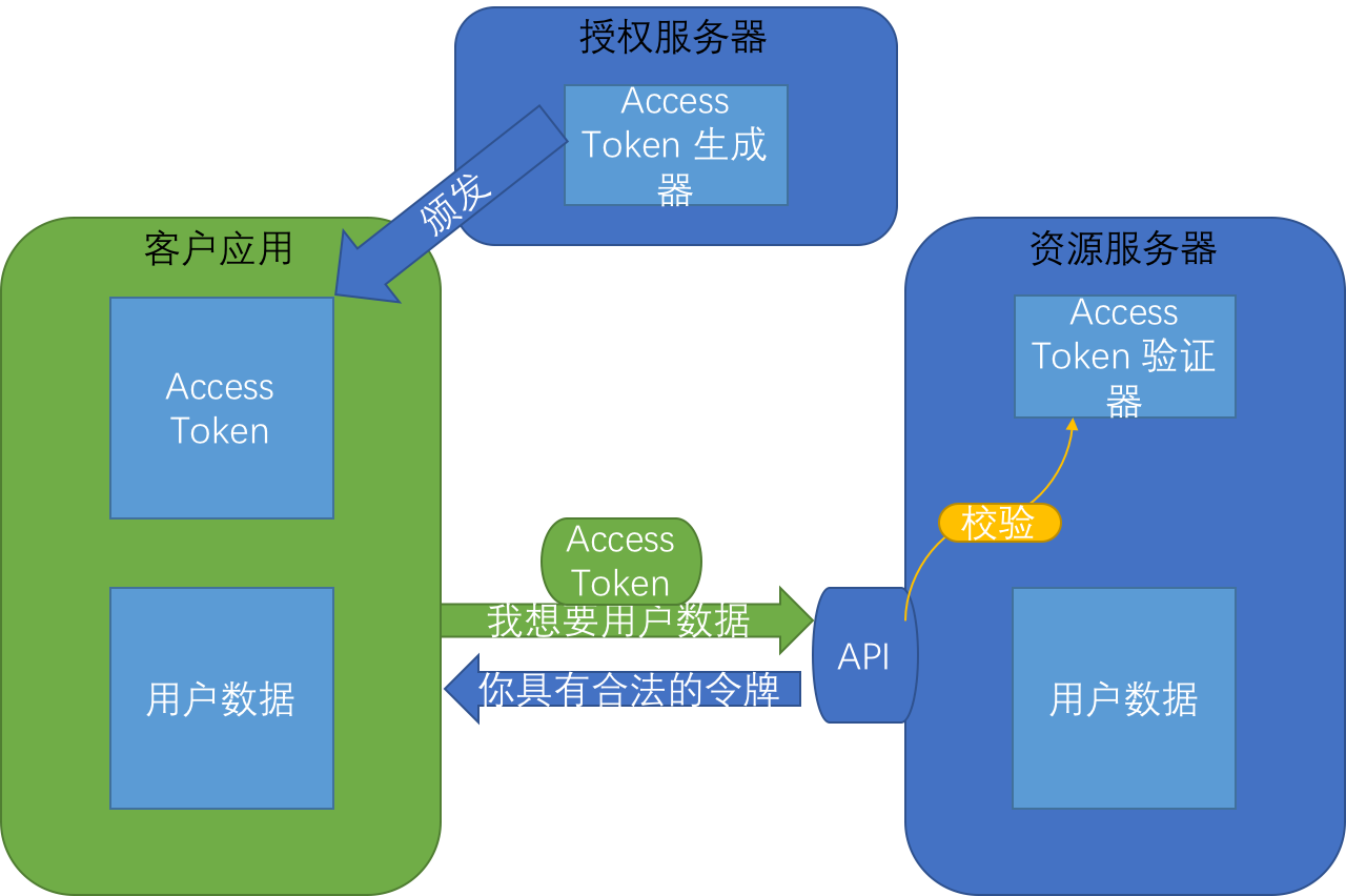 所以一般业界的解决方案是给予客户应用一个“出入证”——专业称为访问令牌(Access Token)。如果来访问的客户应用带有合法的访问令牌,则可以给他数据,否则便拒绝。