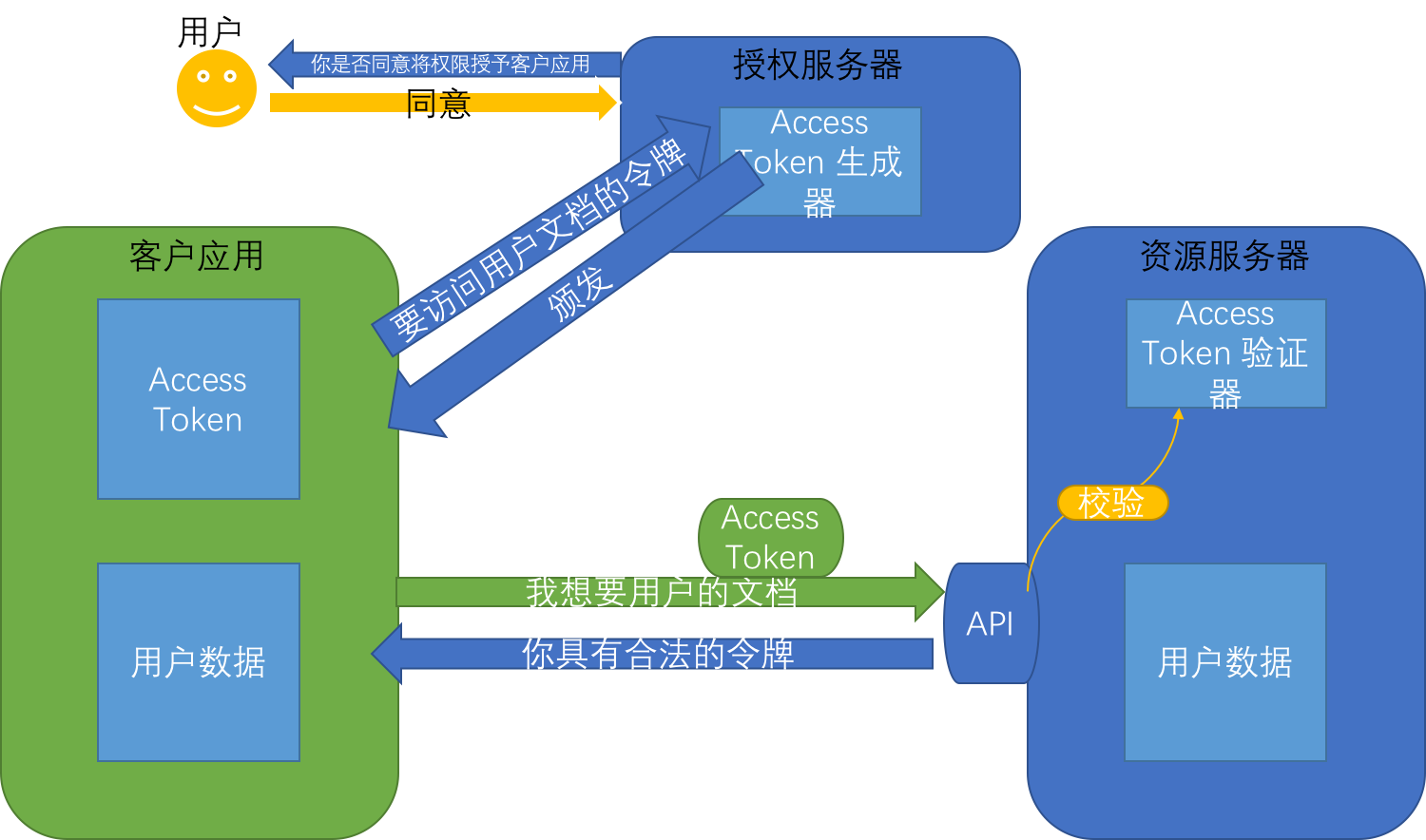 到此为止我们其实还面临着一个问题,那就是当我们获取用户数据的时候,虽然我们允许第三方的客户应用获取用户数据,用户本人却不一定允许。比如,用户在我们系统里存储了图片、文档、视频等数据,用户只允许第三方应用获取他的文档,而不允许第三方应用获取他的图片和视频。所以在我们颁发给客户应用相关权限的Access Token的时候,需要经过用户的同意。