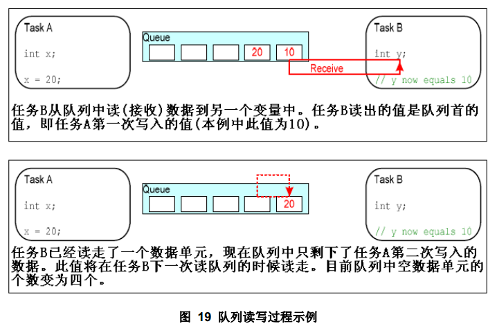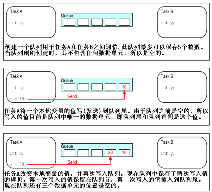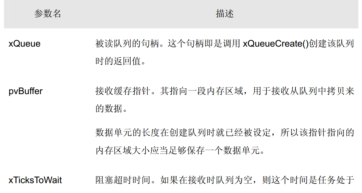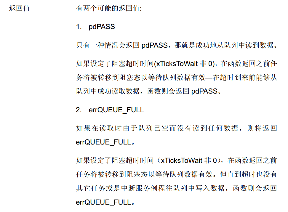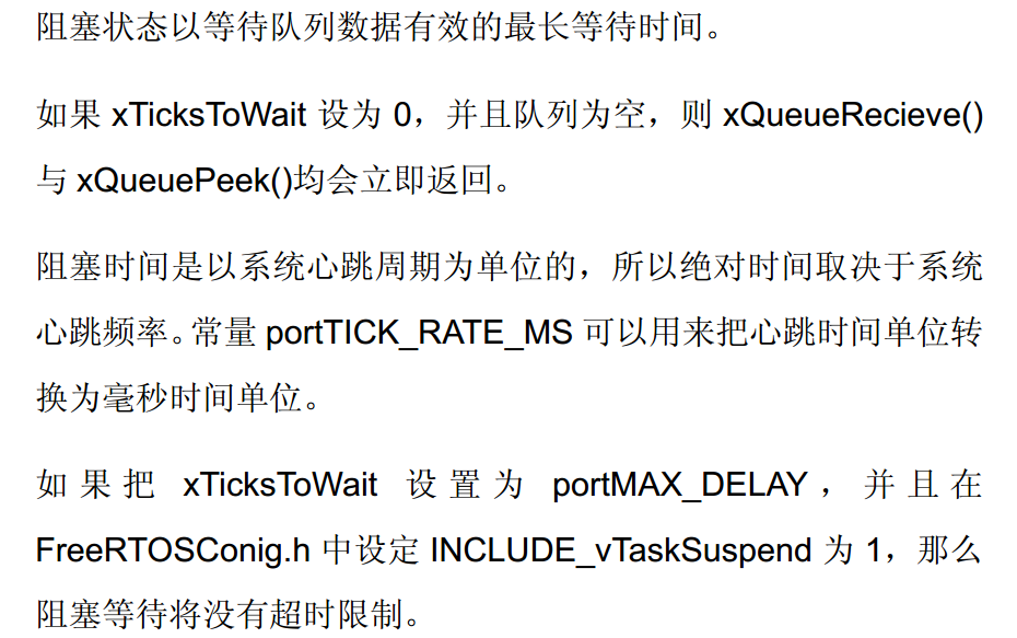 果队列为空,该任务将保持阻塞状态以等待队列数据有效。当其它任务或中断服务例程