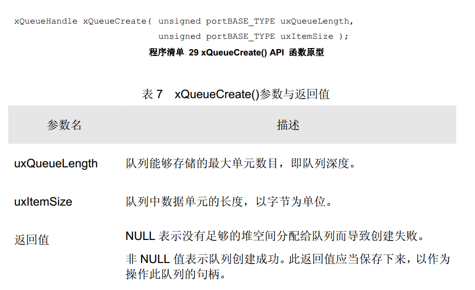 列,并返回一个 xQueueHandle 句柄以便于对其创建的队列进行引用。