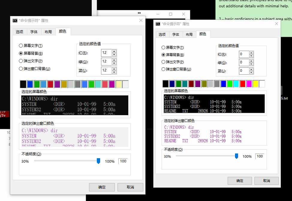 这个时候可以秀一波 screenfetch (滑稽),好了现在来解决下一个坑,在某些电脑中会话窗口的配色有很严重的问题,即蓝色很暗看不清,但是有些电脑又没有问题(不清楚触发条件,我给公司电脑装的时候有问题,家里电脑又没问题,系统内部版本相同,难道是I卡和A卡的区别?逃),WSL的会话窗口配色实际上取决于 CMD 属性里颜色标签里面的配色,发现两台电脑的配色的色值还真不一样(如下图)