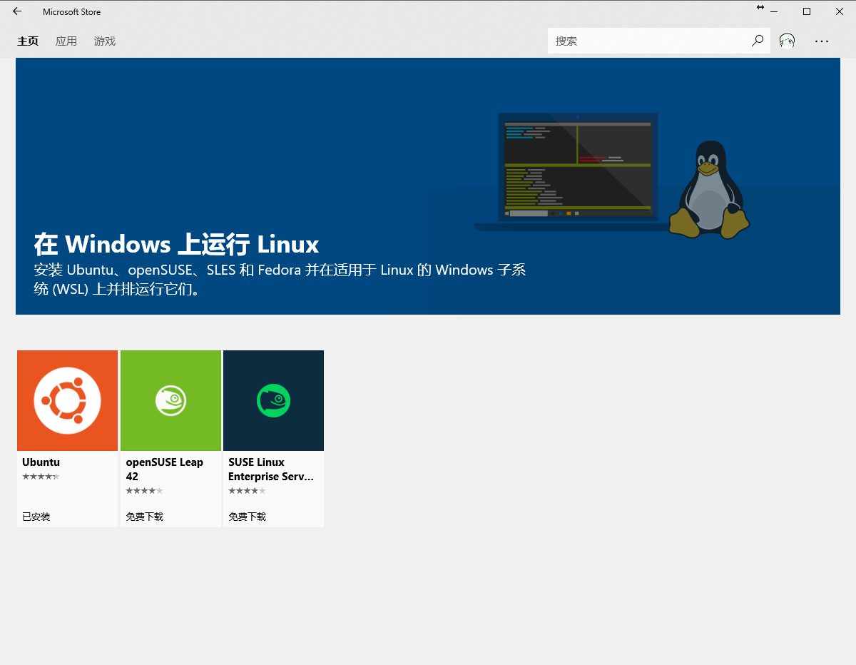 打开 Microsoft Store , 搜索 Linux 会有三个结果 Ubuntu , openSUSE Leap42 , SUSE Linux Enterprise Srever