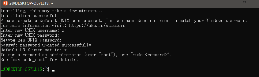 重启之后再次打开 Ubuntu 就可以使用了,根据提示输入用户名,两次输入密码就可以看见熟悉的命令行