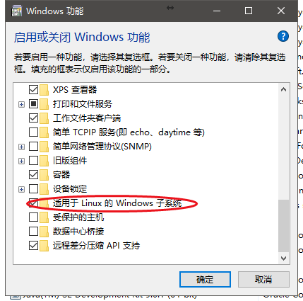 找到 适用于Linux的Windows子系统 并勾选,然后 确定 选择 立即重新启动