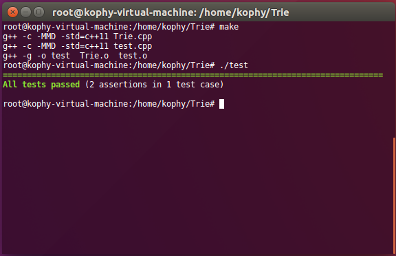 此处TEST_CASE里的两个section,第一个section是查找Trie中存在的单词,第二个section是查找Trie中不存在的单词。REQUIRE是Catch提供的宏,相当于assert,检验表达式是否成立。