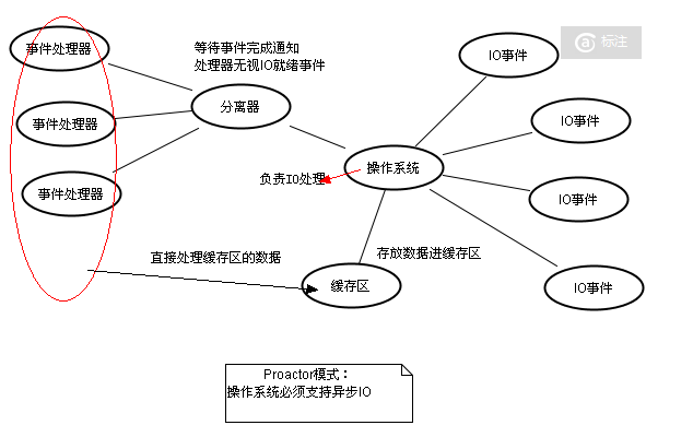 Proactor调用aoi_write后立刻返回,由内核负责写操作,写完后调用相应的回调函数处理后续逻辑;