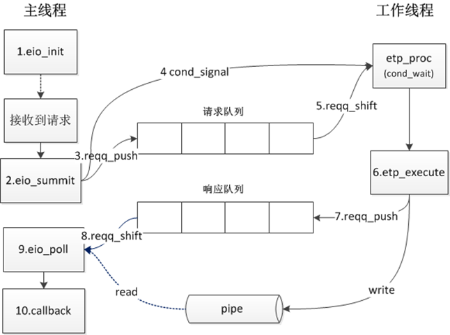 当用户线程调用异步API后,用户线程继续执行自己的任务,AsynchronousOperationProcessor 会开启独立的内核线程执行异步操作,实现真正的异步读写。