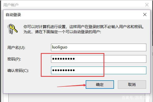 4、在弹出的自动登录窗口中输入开机【密码】和【确定密码】点击【确定】即可。如下图所示: