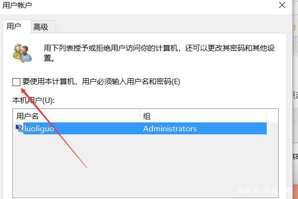 3、在弹出的用户账户窗口中将【要使用本计算机,用户必须输入用户名和密码】选项前的√去掉,然后点击【确定】,如下图所示: