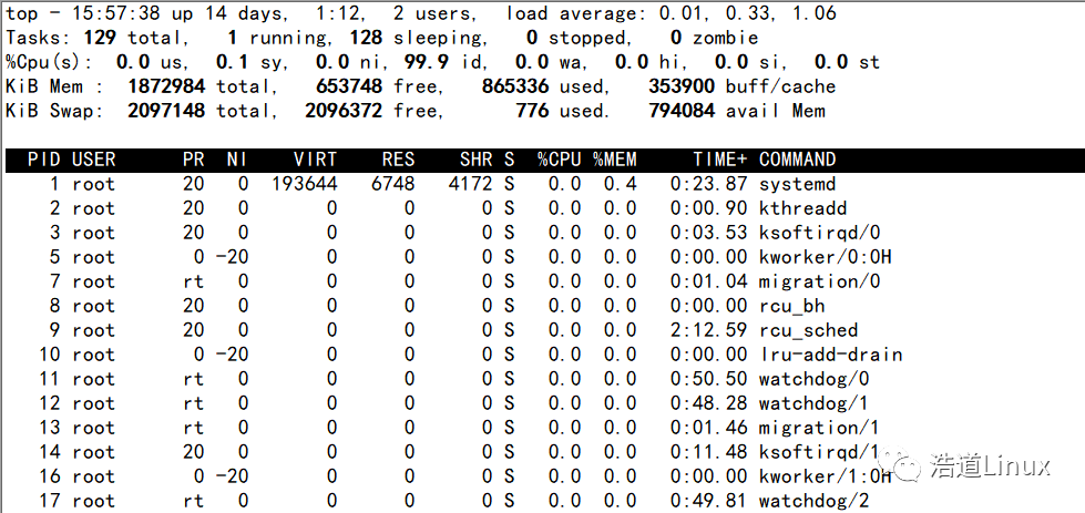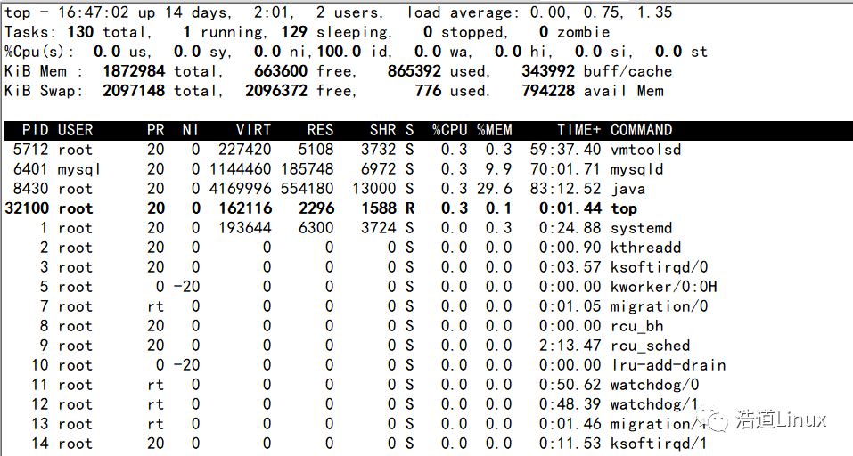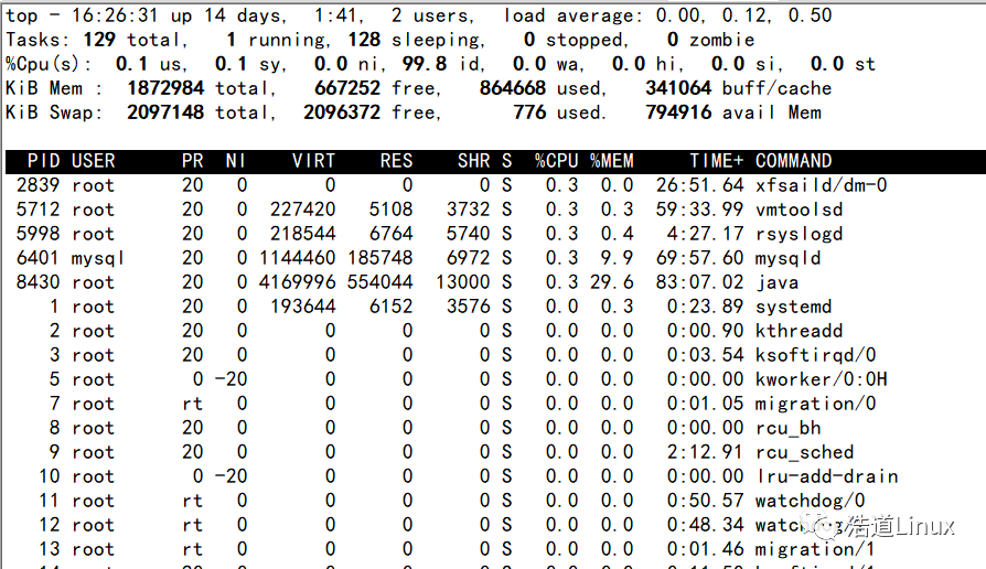 此时先通过top命令查看测试前系统负载情况,如下图所示: