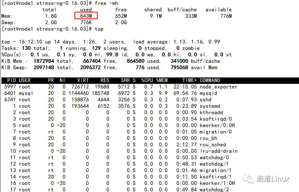 此时先通过free和top命令查看测试前系统内存使用情况,如下图所示: