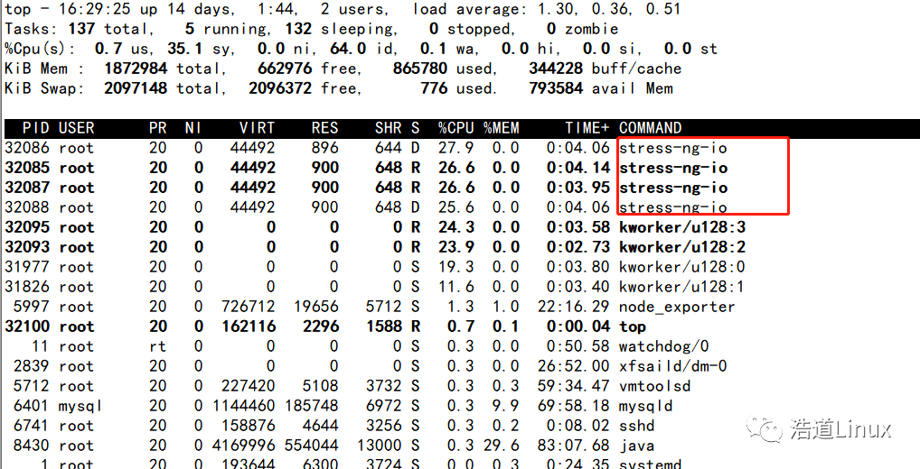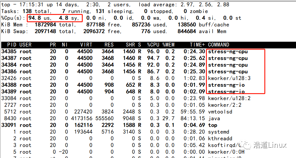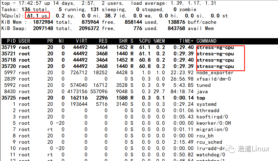 执行压力测试过程中,再通过top命令查看系统负载情况,如下图所示: