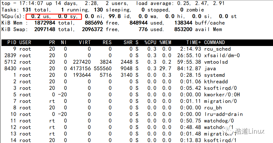 此时先通过top命令查看测试前系统CPU负载情况,如下图所示: