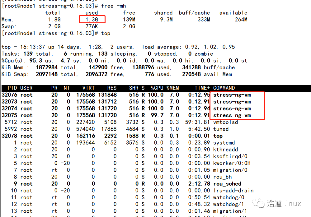 - stress-ng --vm 2 --vm-bytes 1G --timeout 100s 压测内存,持续100秒,使用2个进程占用1G内存,你也可以换成500M什么的