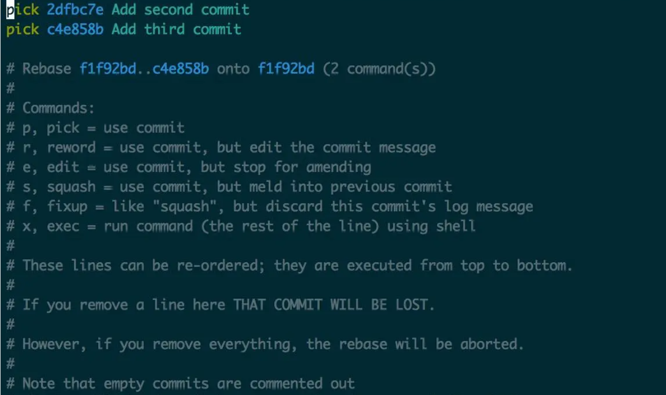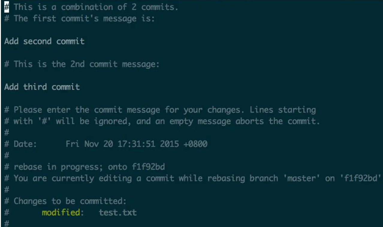 将 c4e858b5 这个 commit 前方的命令改成 squash 或 s,然后输入:wq以保存并退出。