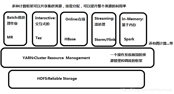 可以在YARN之上跑各种不同的框架,只要它符合YARN的标准就行。这样做的好处,多种计算框架可以共享集群资源,按需分配,你需要多少资源,就取YARN上面申请多少资源,这样可以提升整个资源的利用率。这就是要把各种框架跑在YARN上面的根本原因。