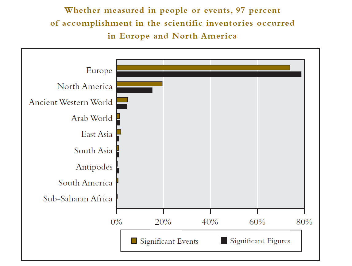 阿拉伯人、华人、日本人、印度人和亚洲其它地区的的文化大都主张家族主义、等级制度和集权主义,这是与可持续的探索和创新相违背的。美国学生在小学和中学阶段学习相对不如东亚学生,可能反映了其远古时代强调’个体学习’ 和’群体学习’ 方式的不同而导致的遗传倾向。然而,欧美国家仍在科技术和商业创新方面领先世界。进化心理学可以部分解释为什么中国很难产生类似罗蒙诺索夫、欧拉、·庞加莱、柯尔莫哥洛夫、冯·诺依曼、康托洛维奇等世界级的大师。Mikhail Lomonosov, Leonhard Euler, Henri Poincaré, AndreyKolmogorov, John von Neumann, or Leonid Kantorovich.