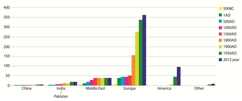 自公元前221年建立秦朝,中国一直是一个中央集权政府。中国的大部分历史并在大部分地区,中国一直保持着单一的书面语言。但在欧洲,集权政府持续时间短并治理较小的区域。因此通过治理多元化和语言的多样性,欧洲在过去的2000年中并到现在比中国有更多的政治变化和环境变化