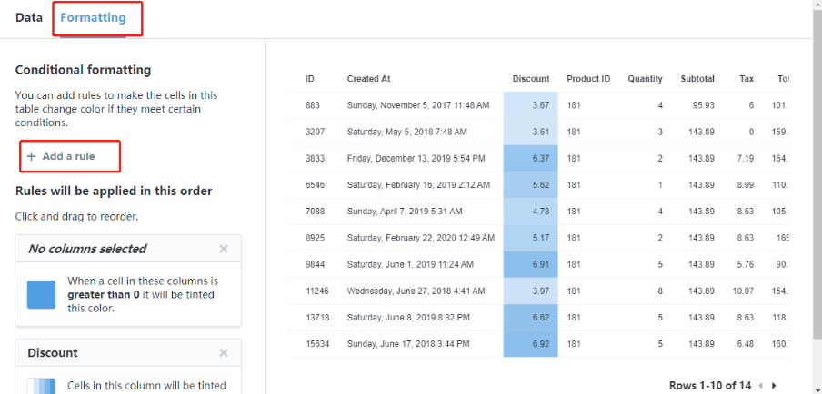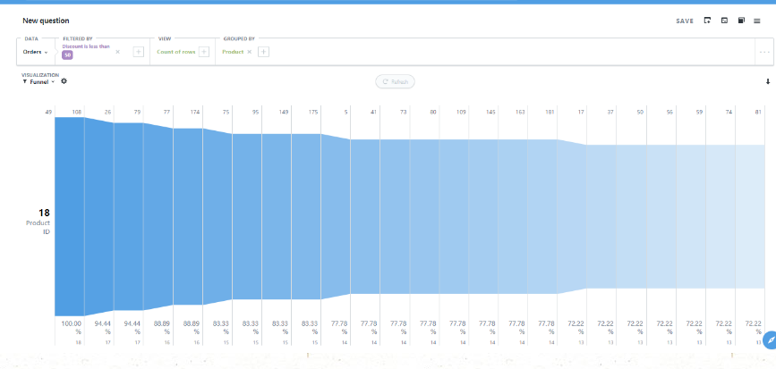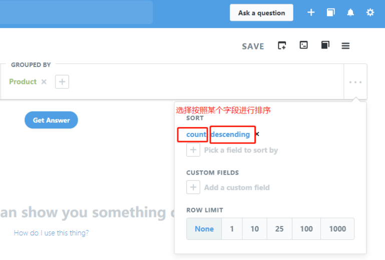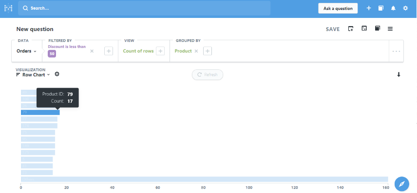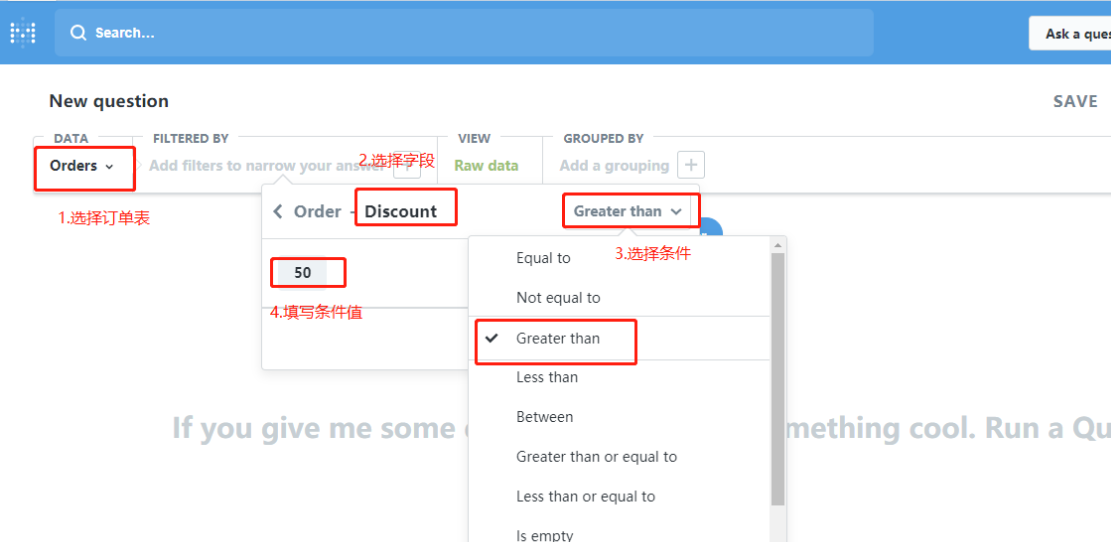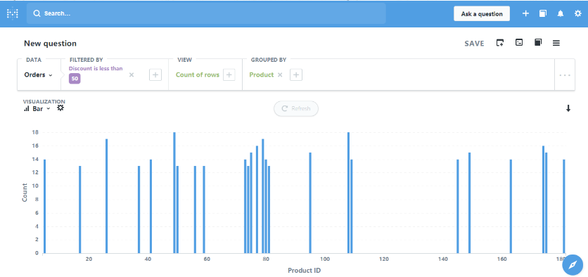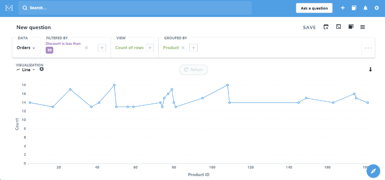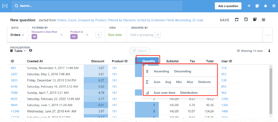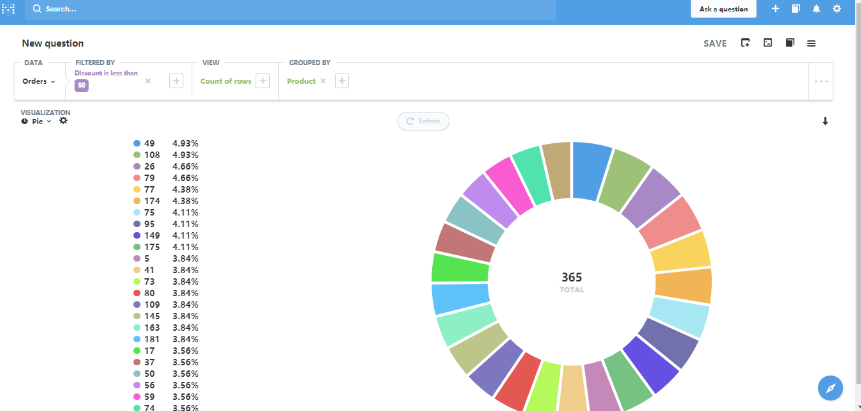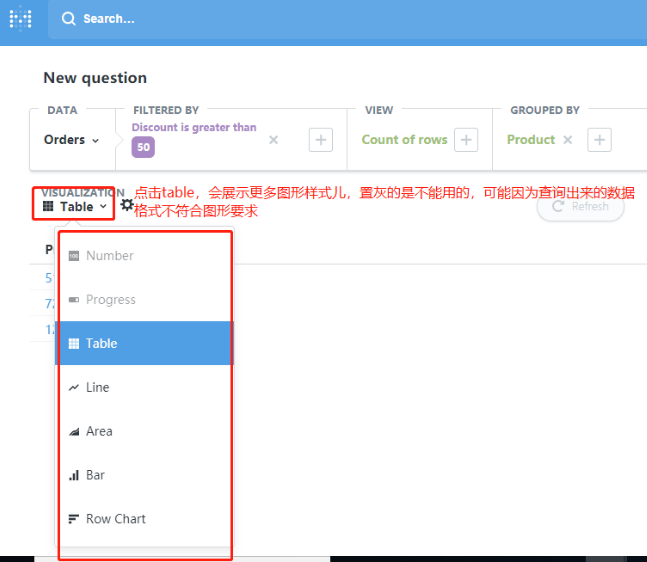 比如有个需求:想查看订单表下discount的值大于50,按照产品分组的统计数据,且要按照统计数量倒序每页显示25条的数据