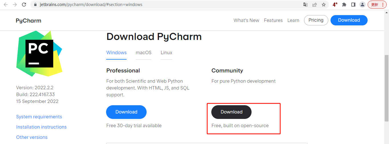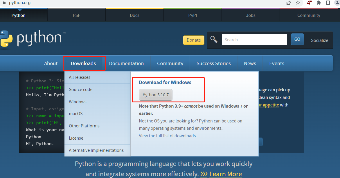 Python官网:https://www.python.org/,如图,Windows最新的python3版本是3.10.7,点击直接下载到本地