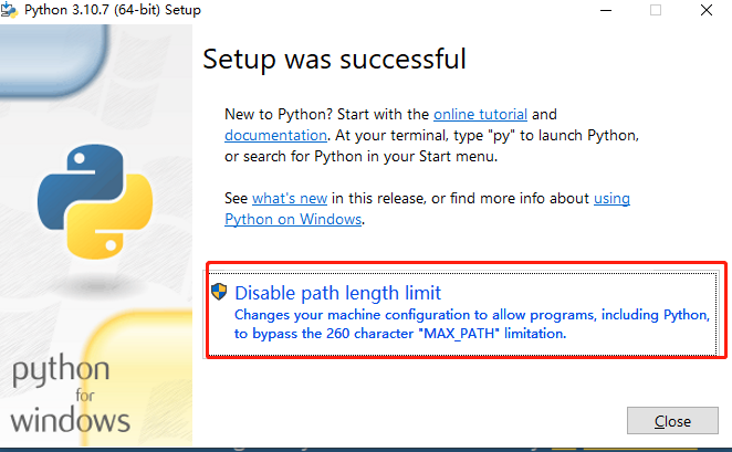 安装成功后,点击 disable path length limit,禁用系统的 Path 长 度自动限制,避免不必要的麻烦。