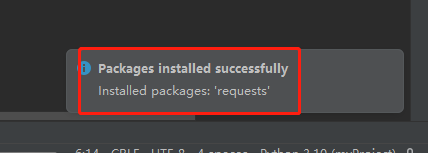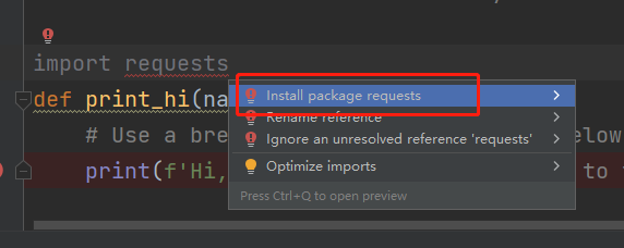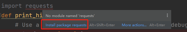 当我们在pycharm中进行requests包导入时会发现,编辑器有报错,光标划过查看提示语,点击后会自动安装成功