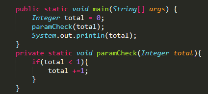 3.将变量作为参数传递,在方法中改变参数值,变量的值改变了么?下图total值到底是几?