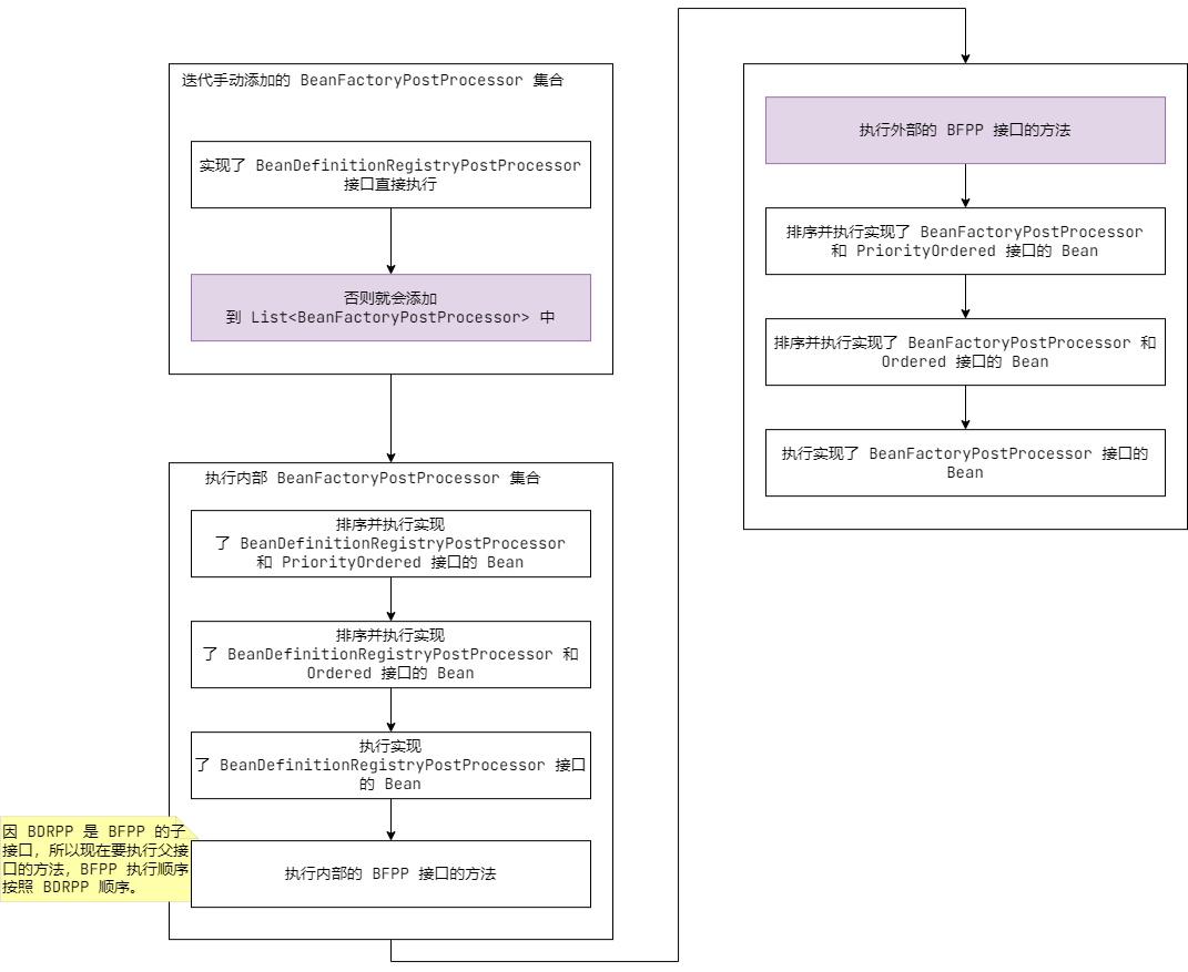 外部 BeanFactoryPostProcessor 和子类的执行顺序是按照添加顺序执行的,会忽略 PriorityOrdered 和 Ordered。