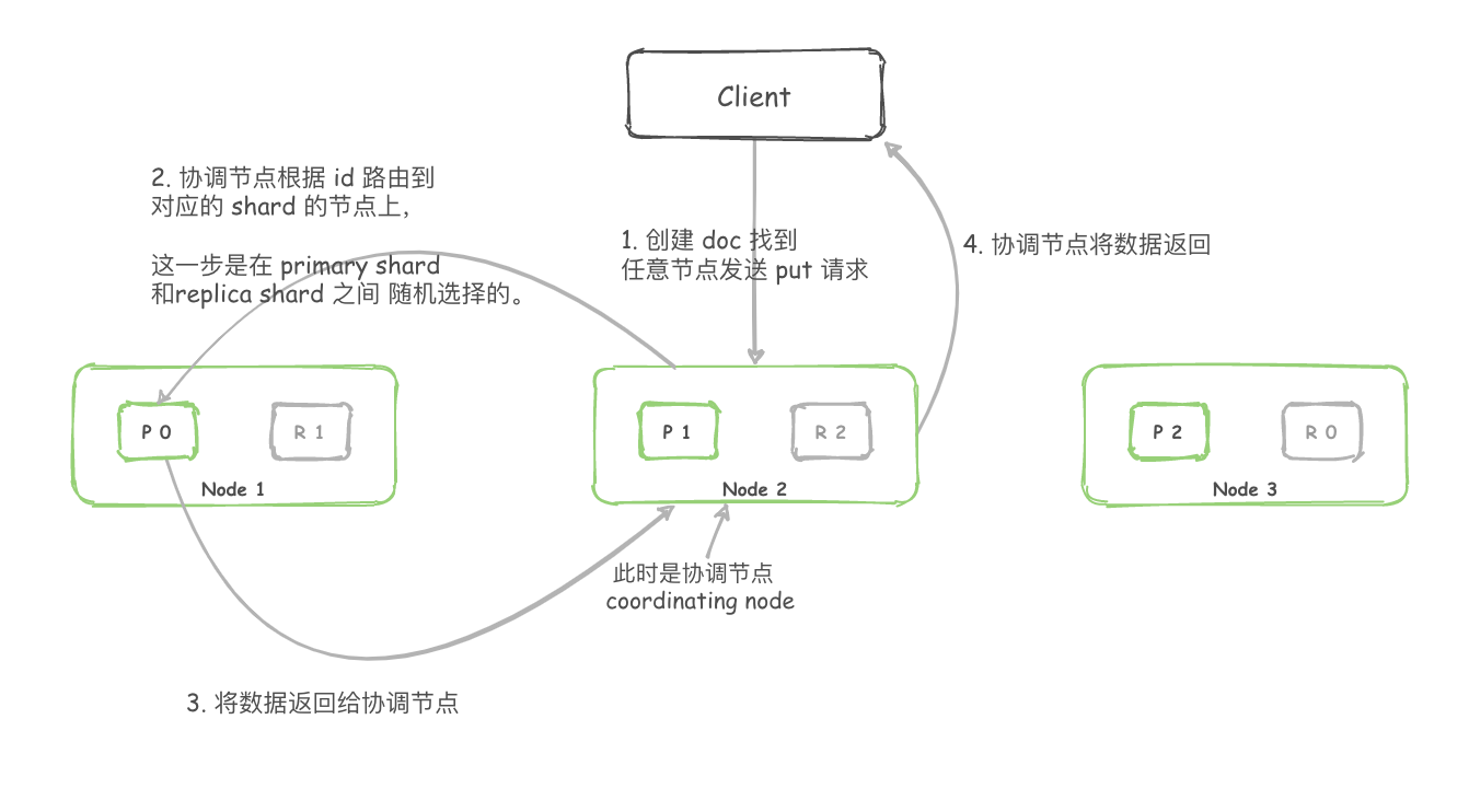 2、协调节点会使用路由算法更具文档 id 路由到具体的数据分片上,分片有可能是主分片也有可能是副本分片