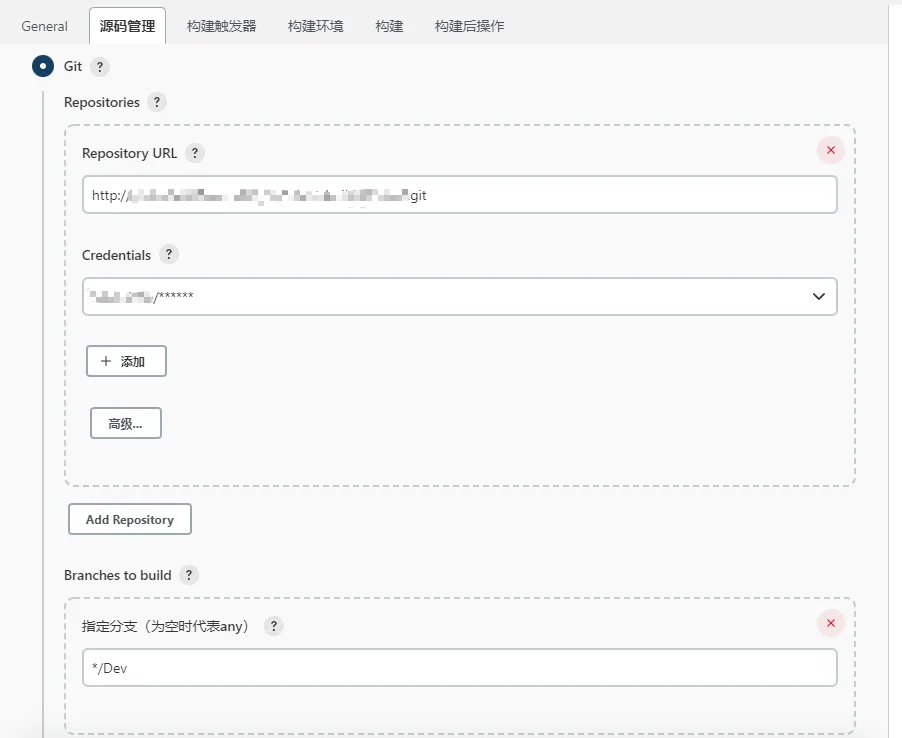 填写你的git项目地址,并添加凭证,即访问这个git的账号密码
