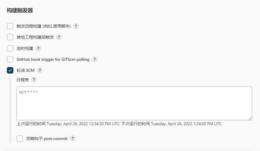 触发器的方式有很多种,这里选择每过1分钟定时扫描,git有改动就触发更新