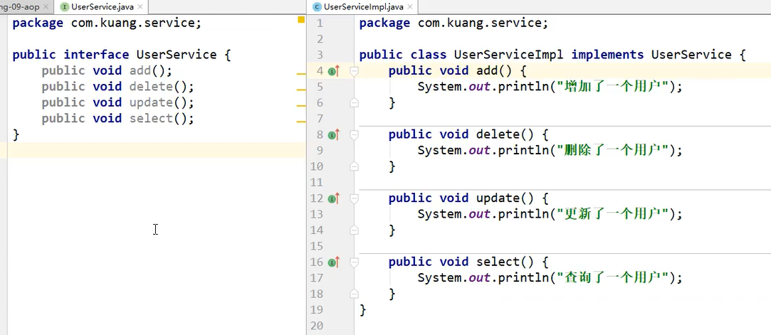3、增加需求,在每一个目标方法执行前增加一个日志实现,比如实现了add方法,实现了delete方法