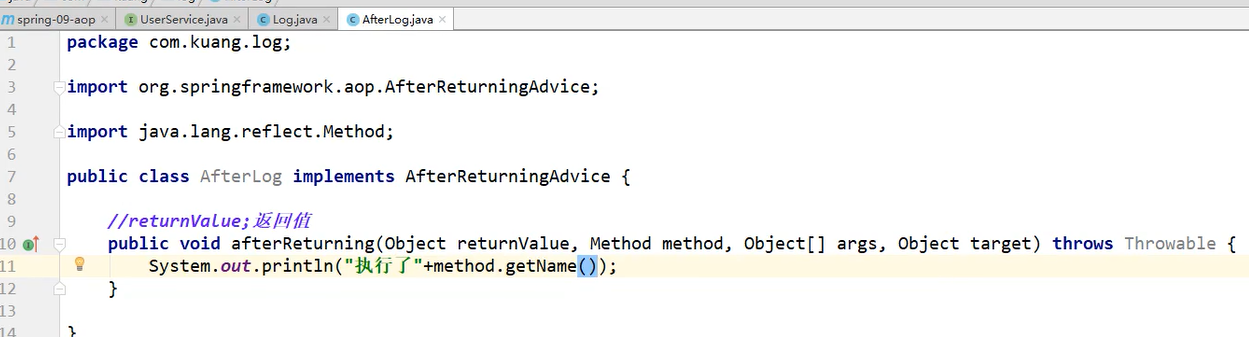(1)增加一个日志类实现 MethodBeforeAdvice,重写before方法