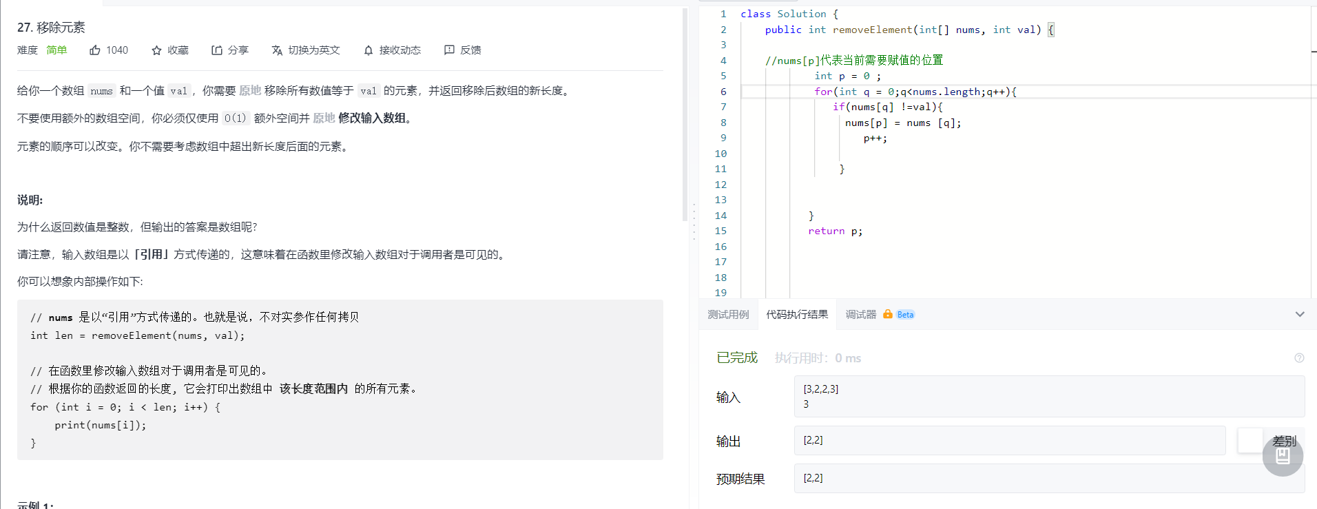 如果q指针指向的元素等于val,它不能在输出数组里,此时左指针不动,右指针右移一位。