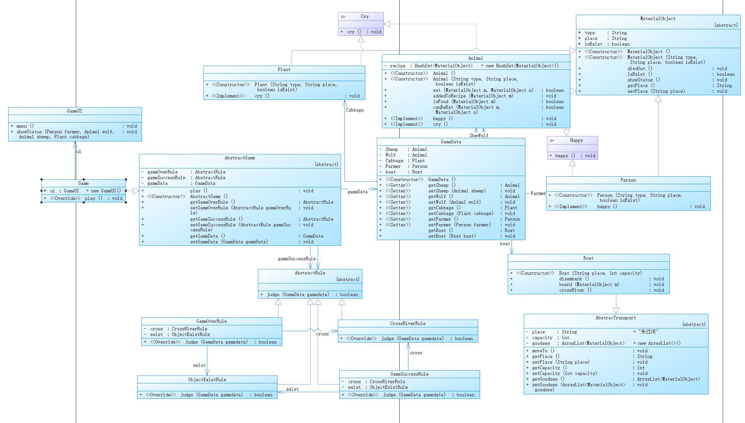 总结:这次的农夫过河写的是最多的,但是拓展性是最好的,可以在Game中增加动物植物等,选择它们吃的对象,也可以在Boat中做修改,改变一次性可以带过河的物品件数。同时掌握了final的使用方法,当用final修饰一个类时,表明这个类不能被继承。也就是说,如果一个类你永远不会让它被继承,就可以用final进行修饰。final类中的成员变量可以根据需要设为final,但是final类中的所有成员方法都会被隐式地指定为final方法。
