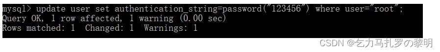 (6)输入命令行update user set authentication_string=password("xxxxxx") where user="root";
