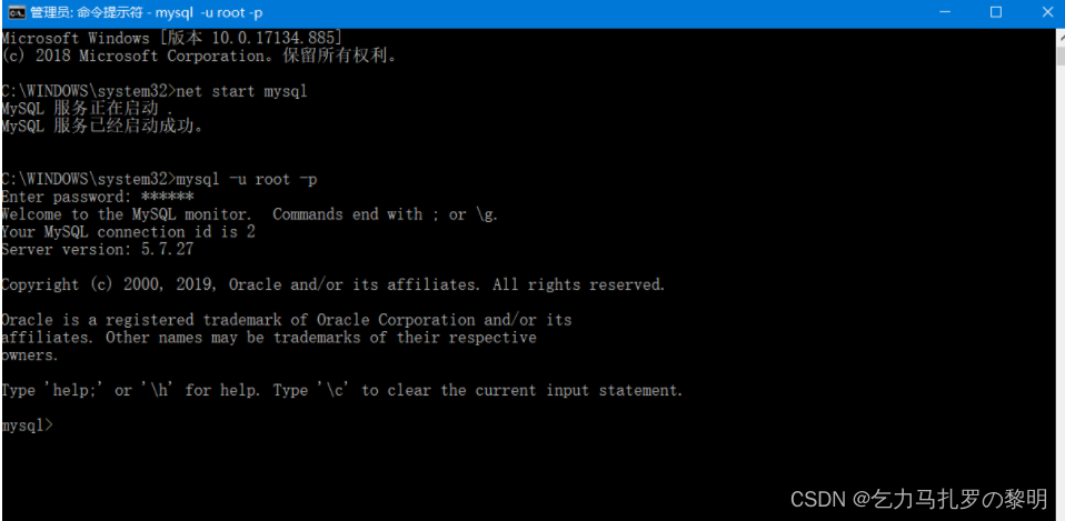 (8) 再次启动cmd(管理员身份),输入启动命令:net start mysql,再输入mysql -u root -p,再输入你刚刚设置的密码,出现以下信息证明设置成功!