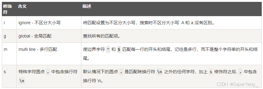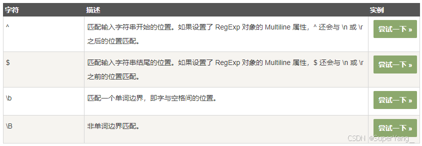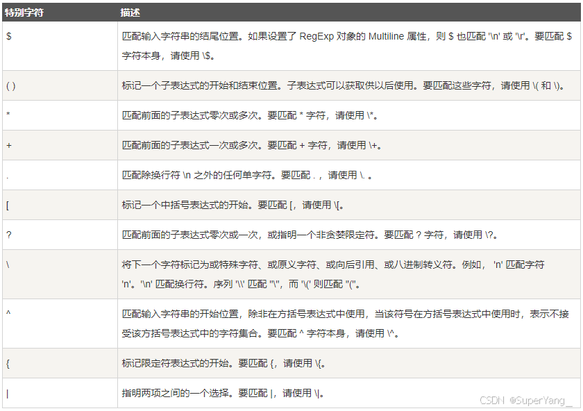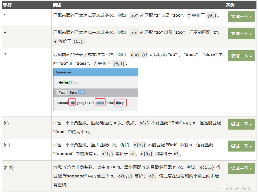 [^ ]:匹配除了括号内的字符以外的任意一个字符。例如,[^abc] 匹配除了字符 “a”、“b” 或 “c” 以外的任意字符