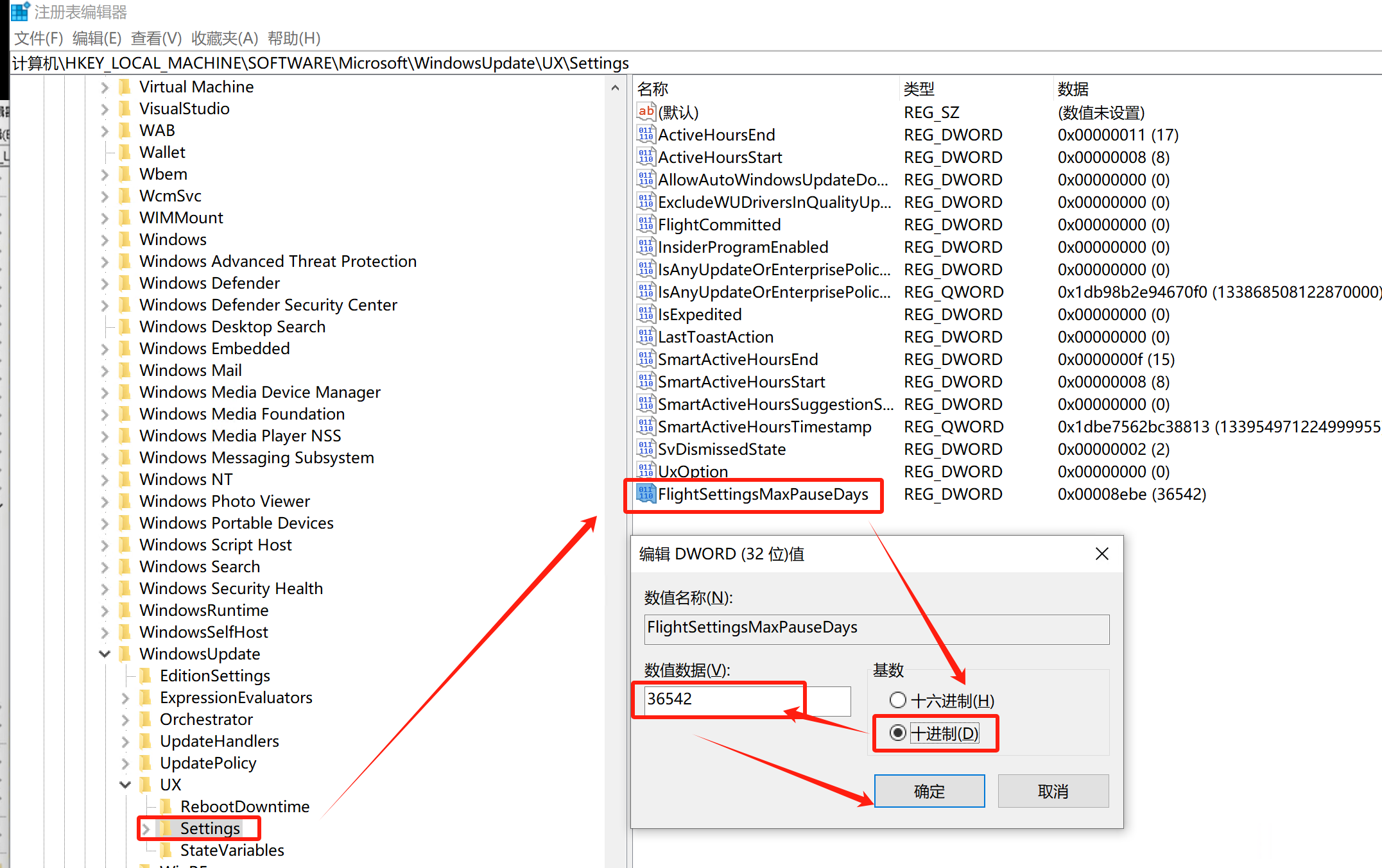 3、右键->新建->DWORD(32位值),命名为“FlightSettingsMaxPauseDays”,选择“十进制”,值设置为36542;