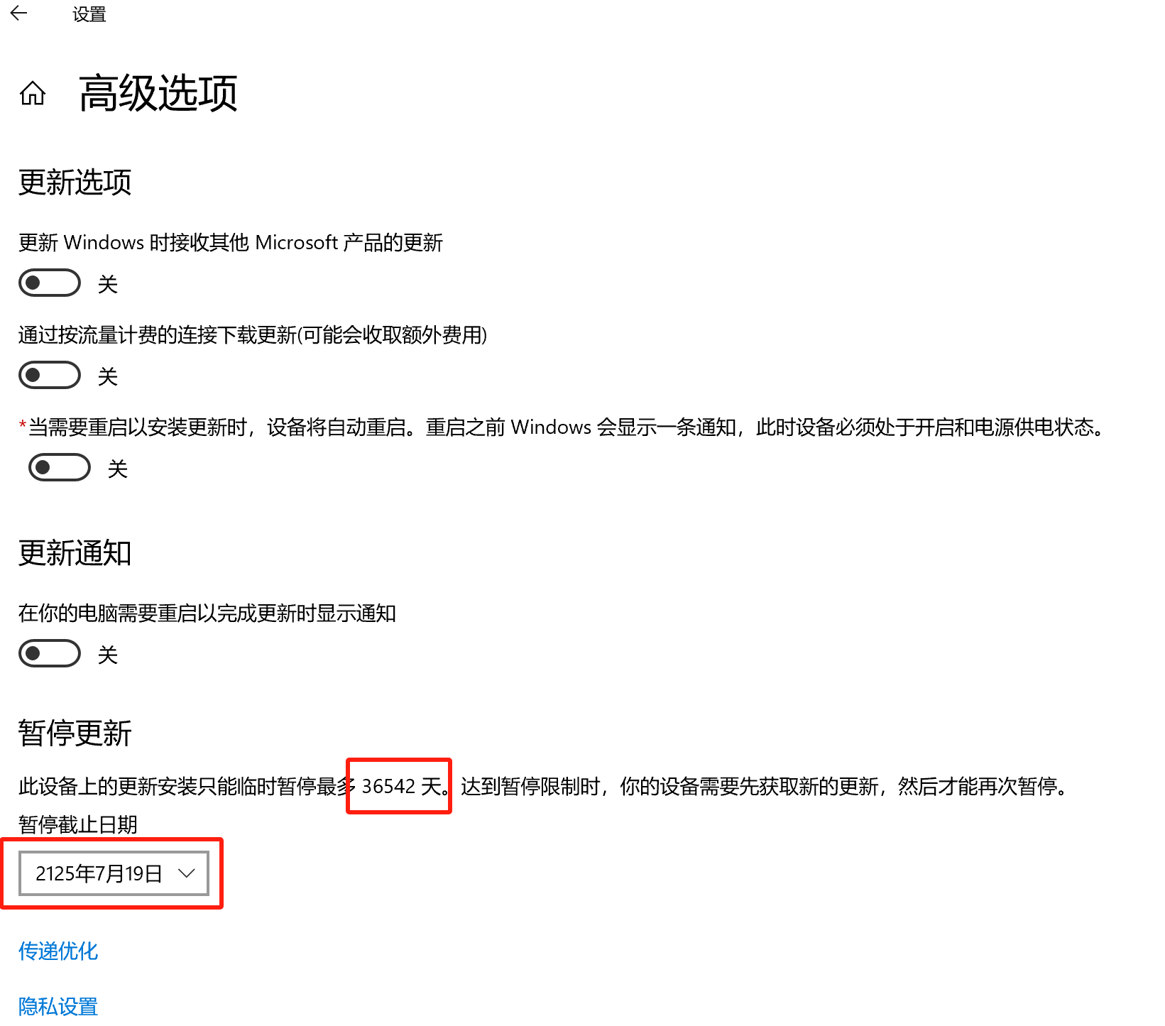 4、Windows设置,选择“更新和安全”,进入“Windows更新”,选择“高级选项”,“暂停更新”最即可暂停100年。