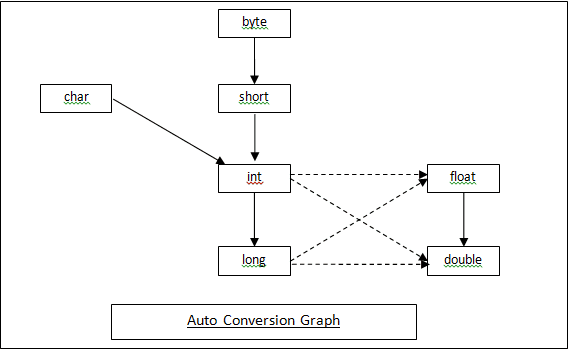 注意:char 类型比较特殊,char 自动转换成 int、long、float 和 double,但 byte 和 short 不能自动转换为 char,而且 char 也不能自动转换为 byte 或 short。