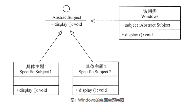 分析:Windows 的主题是桌面背景图片、窗口颜色和声音等元素的组合。用户可以根据自己的喜爱更换自己的桌面主题,也可以从网上下载新的主题。这些主题有共同的特点,可以为其定义一个抽象类(Abstract Subject),而每个具体的主题(Specific Subject)是其子类。用户窗体可以根据需要选择或者增加新的主题,而不需要修改原代码,所以它是满足开闭原则的,其类图如图 1 所示。