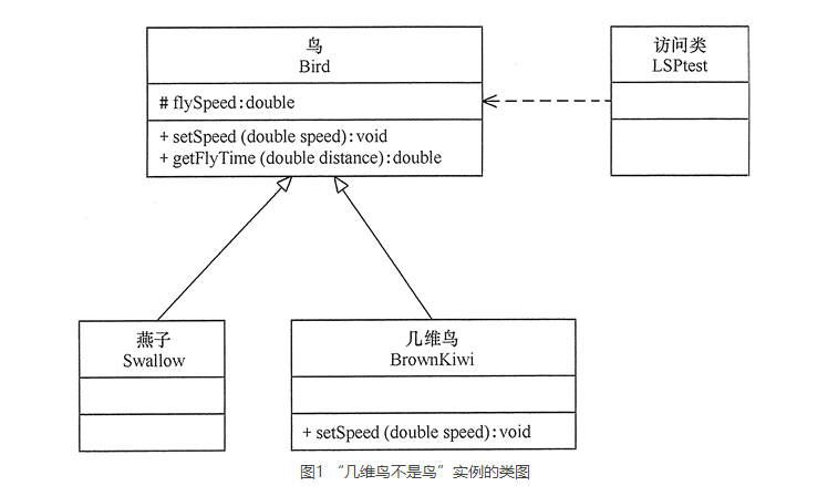 分析:鸟一般都会飞行,如燕子的飞行速度大概是每小时 120 千米。但是新西兰的几维鸟由于翅膀退化无法飞行。假如要设计一个实例,计算这两种鸟飞行 300 千米要花费的时间。显然,拿燕子来测试这段代码,结果正确,能计算出所需要的时间;但拿几维鸟来测试,结果会发生“除零异常”或是“无穷大”,明显不符合预期,其类图如图 1 所示。