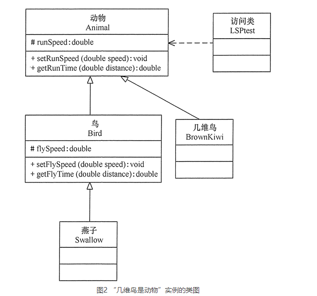 下面以“几维鸟不是鸟”为例来说明里氏替换原则。【例2】里氏替换原则在“几维鸟不是鸟”实例中的应用。