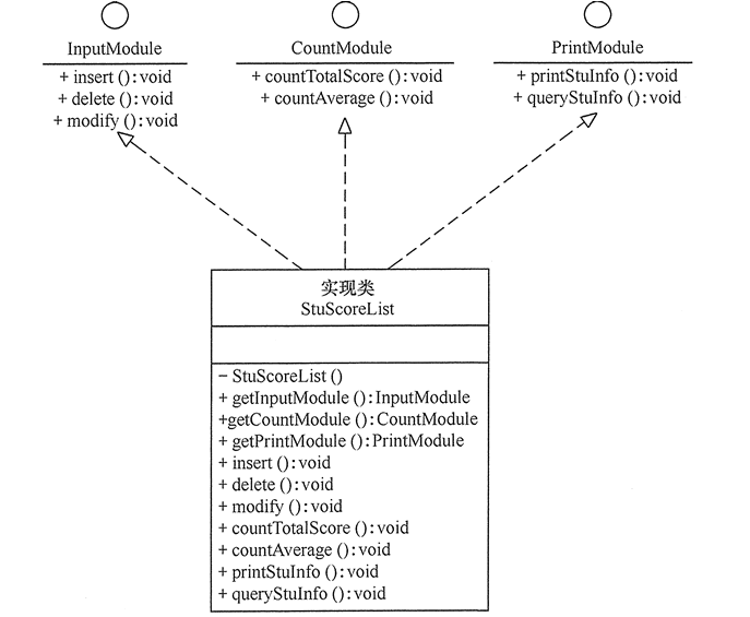 分析:学生成绩管理程序一般包含插入成绩、删除成绩、修改成绩、计算总分、计算均分、打印成绩信息、査询成绩信息等功能,如果将这些功能全部放到一个接口中显然不太合理,正确的做法是将它们分别放在输入模块、统计模块和打印模块等 3 个模块中,其类图如图所示。