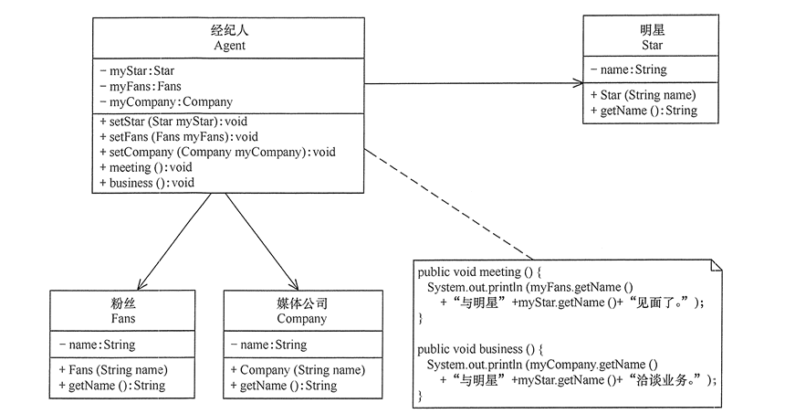 分析:明星由于全身心投入艺术,所以许多日常事务由经纪人负责处理,如与粉丝的见面会,与媒体公司的业务洽淡等。这里的经纪人是明星的朋友,而粉丝和媒体公司是陌生人,所以适合使用迪米特法则,其类图如图 所示。