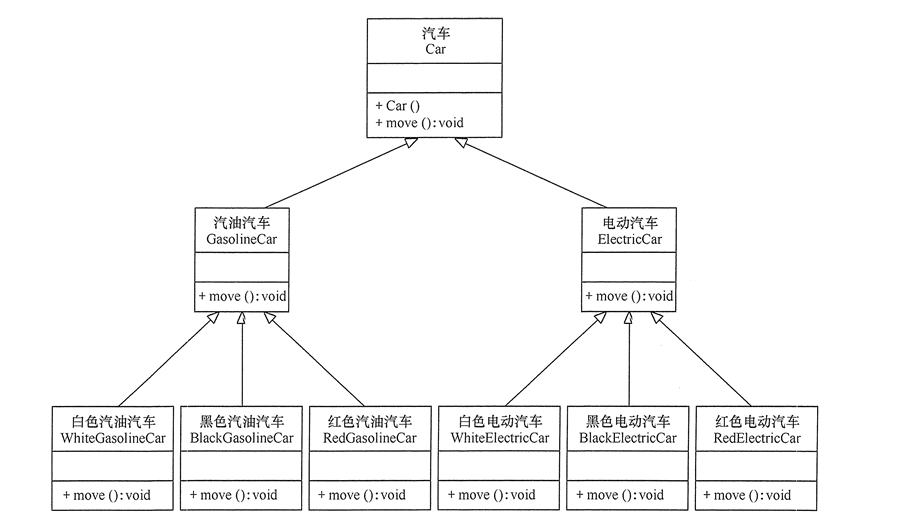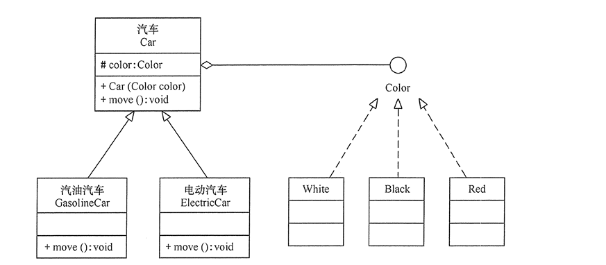 从图可以看出用继承关系实现会产生很多子类,而且增加新的“动力源”或者增加新的“颜色”都要修改源代码,这违背了开闭原则,显然不可取。但如果改用组合关系实现就能很好地解决以上问题,其类图如下图所示。