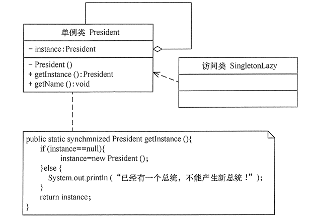 分析:在每一届任期内,美国的总统只有一人,所以本实例适合用单例模式实现,下图所示是用懒汉式单例实现的结构图。