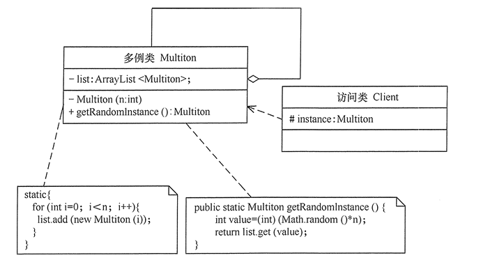 单例模式可扩展为有限的多例(Multitcm)模式,这种模式可生成有限个实例并保存在 ArmyList 中,客户需要时可随机获取,其结构图如图所示。